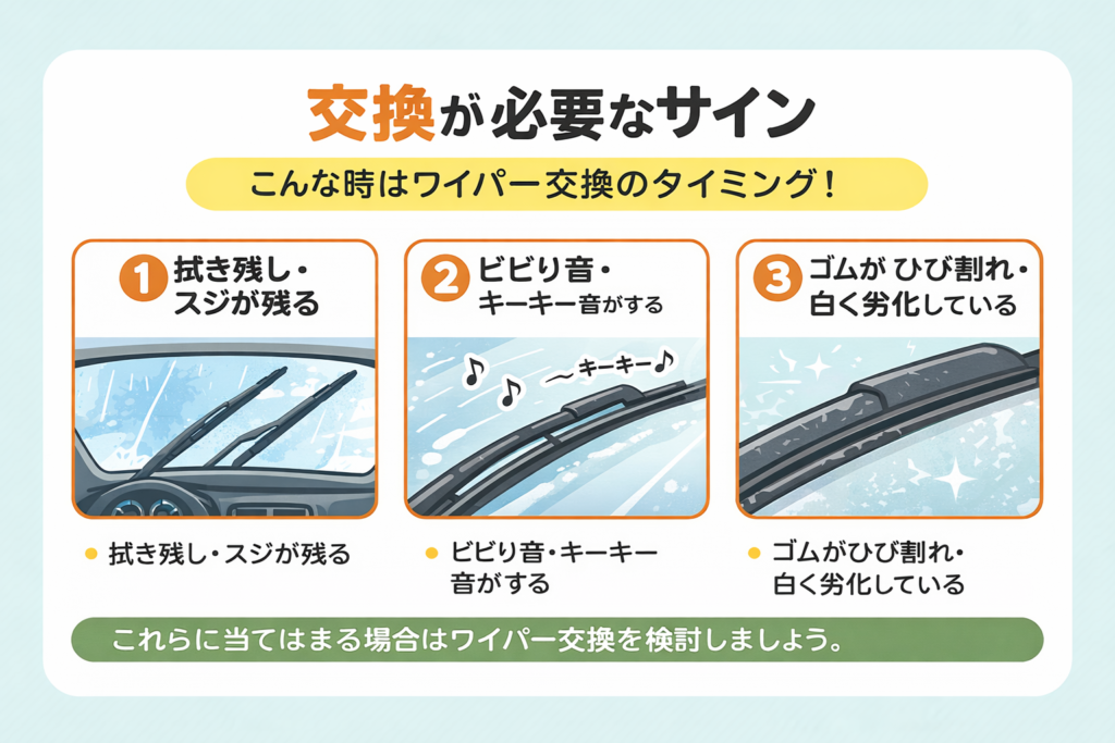 これらのサインが当てはまる場合は、ワイパーの交換を検討するタイミングです。